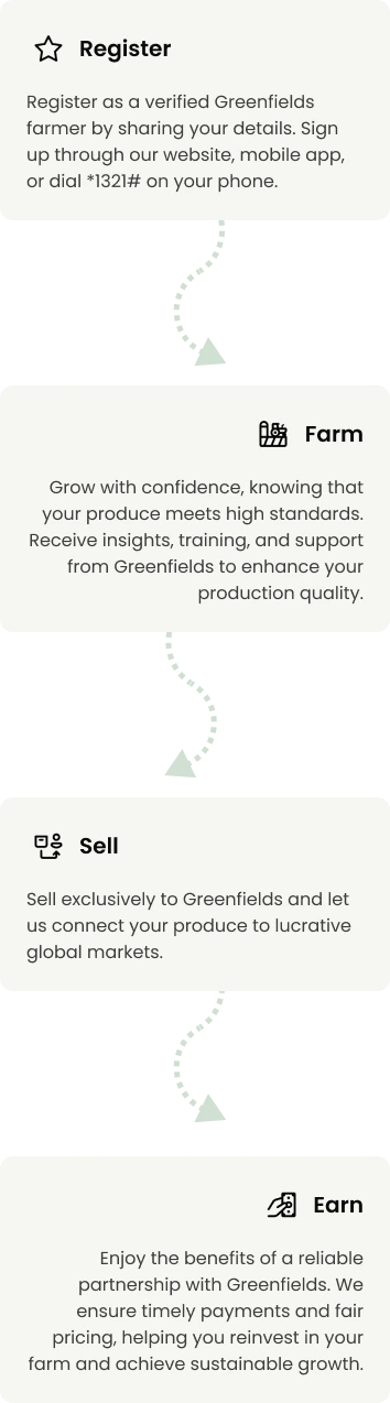 Partner with Greenfields to transform your farming potential into sustainable earnings. We ensure that you get the best value for your hard work by offering fair prices and access to markets that appreciate quality. Focus on what you do best—producing top-quality crops and livestock—while we handle the rest.