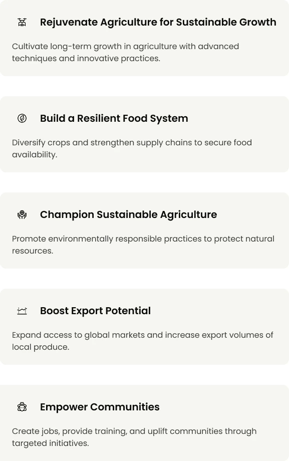 Partnering with Greenfields is more than just a collaboration—it’s a chance to create lasting, sustainable change in agriculture and uplift local communities. Our partnerships directly support our five core aims: modernizing agriculture, expanding market access, fostering local economic development, promoting environmental sustainability, and ensuring food security.